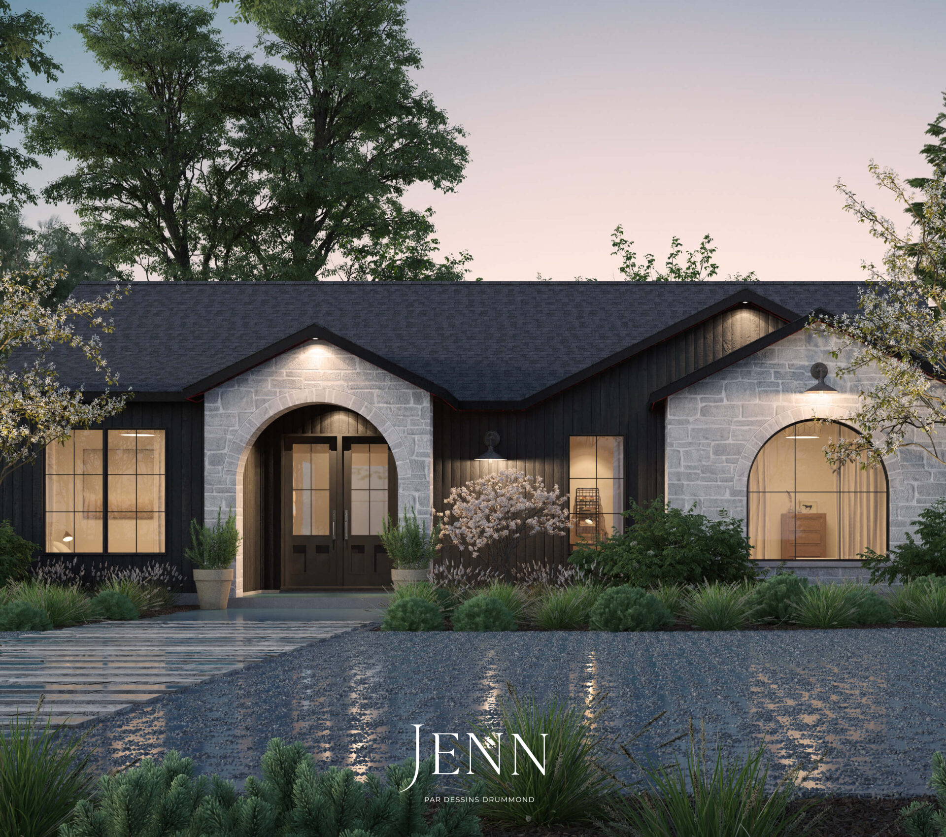 Le projet Andrews est un plain-pied sur dalle conçu pour une jeune famille de Val D’or qui souhaitait un style distinct du farmhouse qu’on voit beaucoup par ses temps ci. Inspiré de l’univers de la designer Amber Lewis, nous avons exploré une approche d’architecture belge : toitures à faible pente, volumes plus étendus, formes simples et un mélange de matériaux bruts qui apportent authenticité et caractère.La configuration en coin du terrain a permis d’intégrer un garage latéral en retrait, directement relié aux espaces fonctionnels de la maison : salle de lavage, mudroom avec accès au garde-manger, et salle d’eau. Un aspect que j’apprécie particulièrement est la fluidité de l’architecture, mise en valeur par l’intégration d’arches qui se répètent subtilement — des volumes en pierre de l’entrée principale jusqu’à la fenestration. Un véritable coup de cœur, tant pour la conception que pour la famille derrière ce projet.