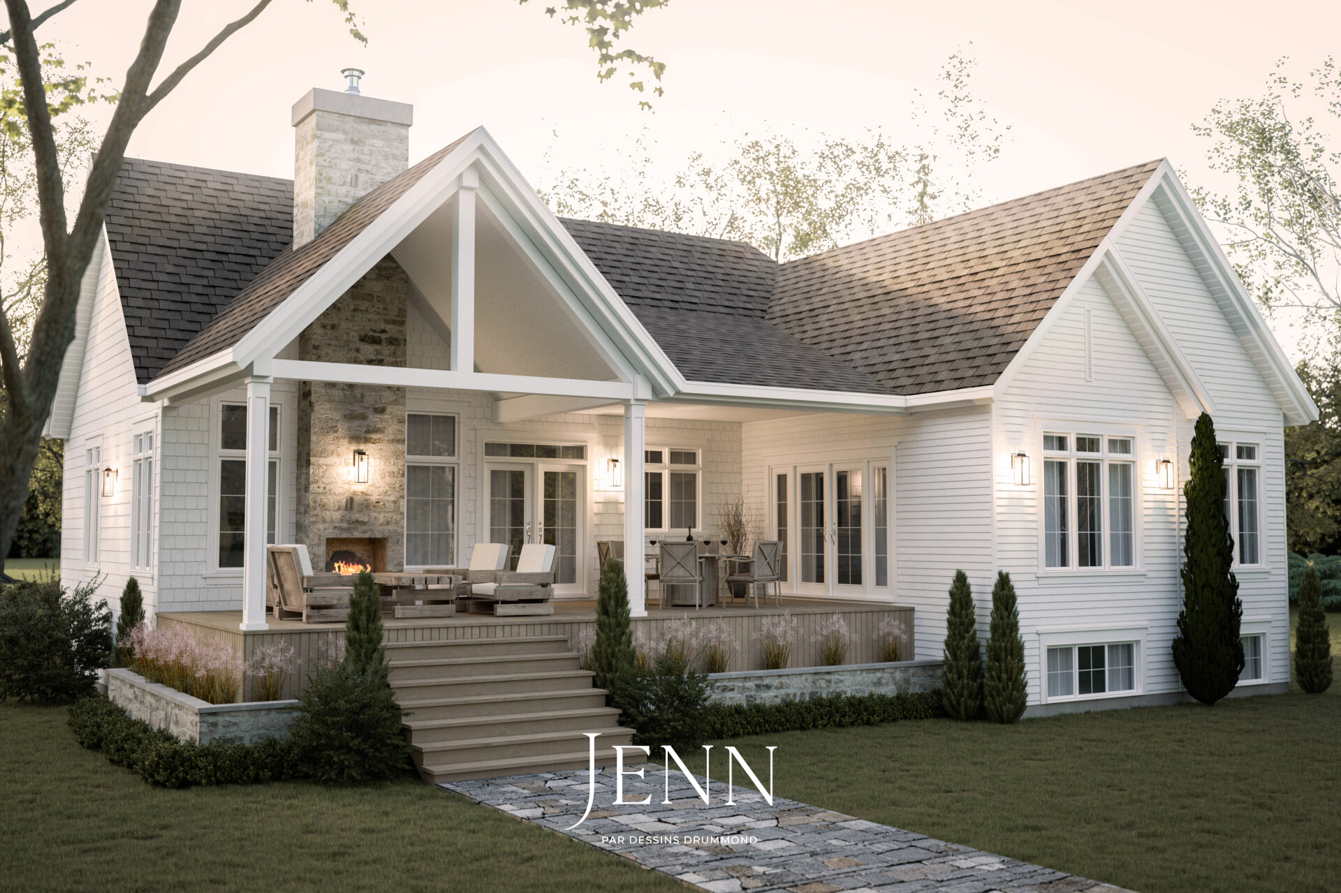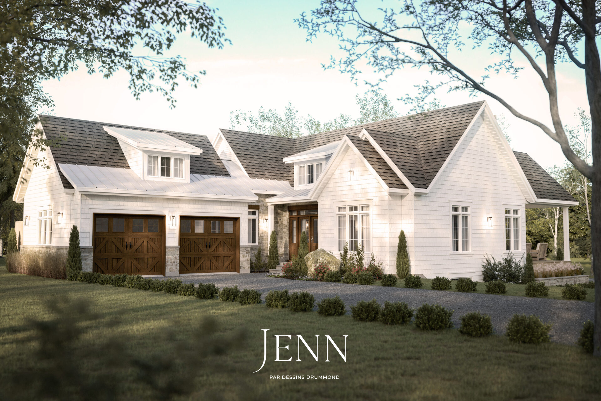 Un projet inspiré du style Cape Cod, rehaussé d’une touche de farmhouse campagnarde d’ici. Cette demeure allie avec élégance l’imitation du bardeau de cèdre, le lambris horizontal et la pierre aux tons doux et beigés, crée une élégance naturelle et intemporelle. Les impostes délicatement intégrées au-dessus des fenêtres et la porte d’entrée qui est une pièce d’art en soi, viennent raffiner l’ensemble, ajoutant ce petit détail qui fait toute la différence. Implantée sur un terrain d’une grande profondeur, la maison profite d’un aménagement réfléchi qui met en valeur sa façade : un garage latéral s’y déploie avec équilibre, soulignant à la fois le caractère pratique et l’esthétique soignée du projet. Une résidence où charme côtier et chaleur campagnarde s’unissent pour offrir un lieu accueillant, à la fois distingué et authentique.